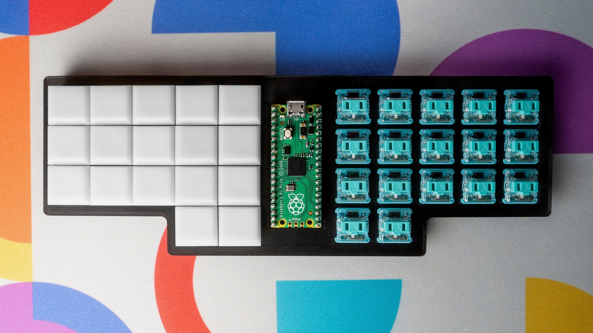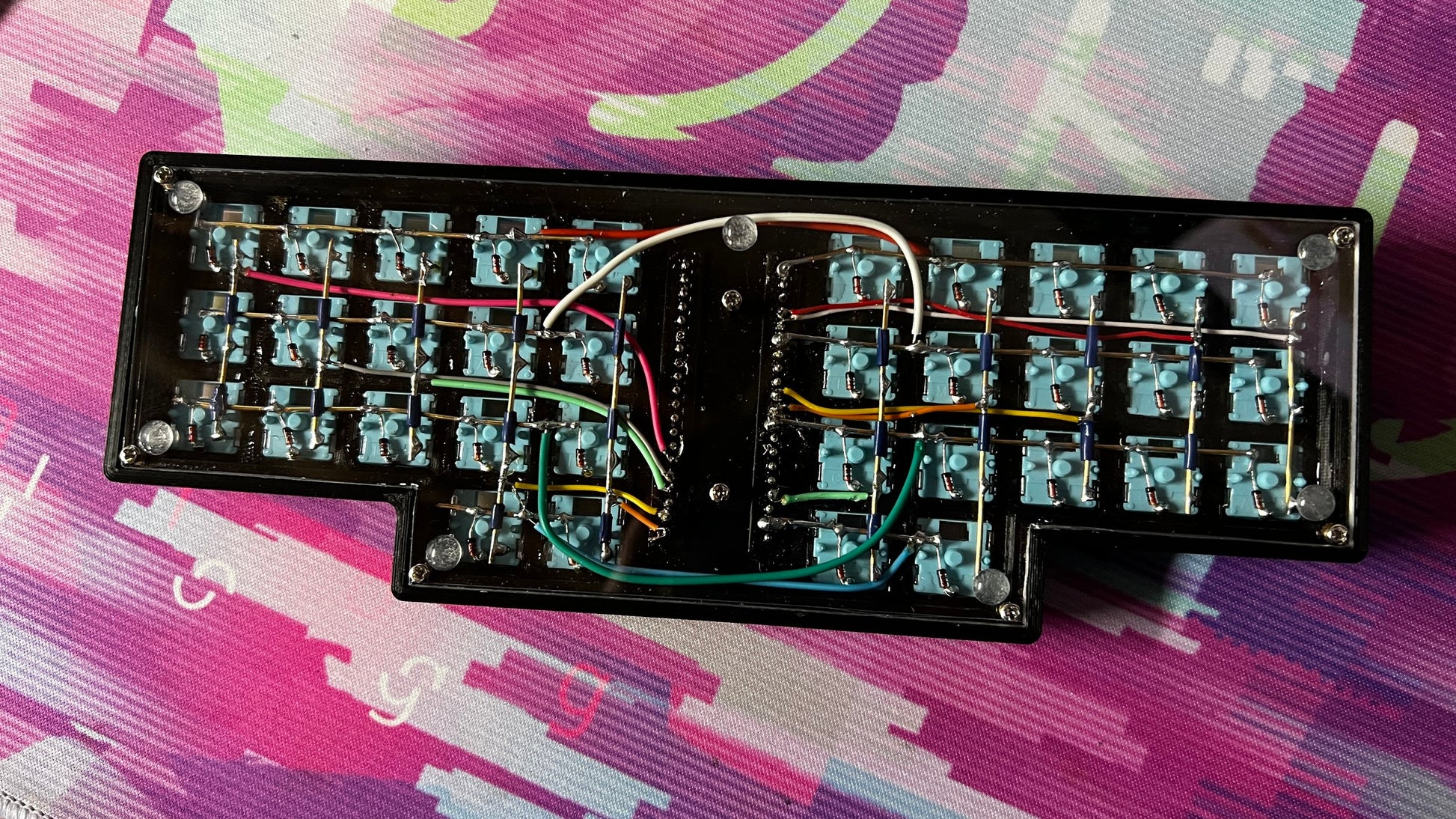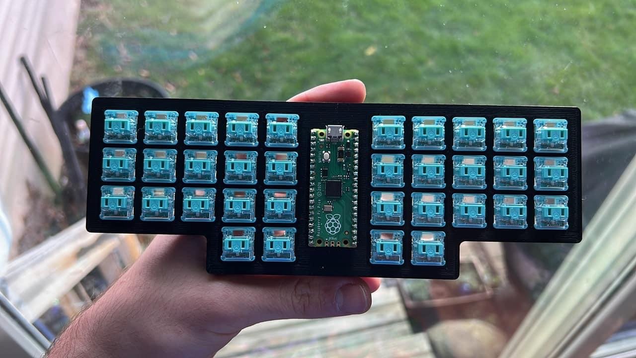 The Scotto34 is a low-profile 34-key split monoblock ortholinear keyboard that uses 18x17mm spaced Choc switches and an exposed controller in the middle.